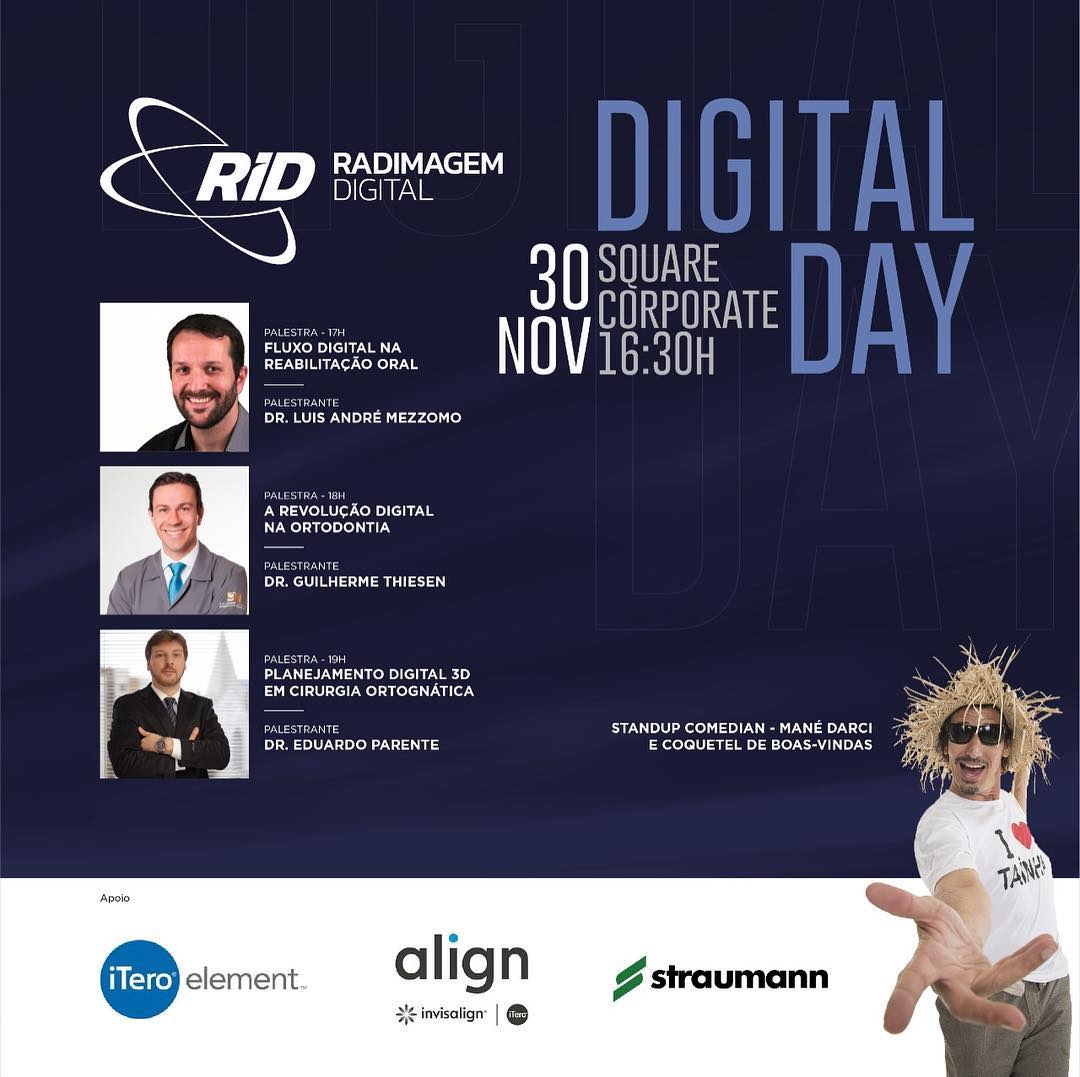 Contaremos com as palestras de Dr. Luis Mezzomo, sobre Fluxo de Reabilitação Oral; Dr. Guilherme Thiesen, a Revolução Digital na Ortodontia; e, por último, Planejamento Digital 3D em Cirurgia Ortognática com o Dr. Eduardo Parente.